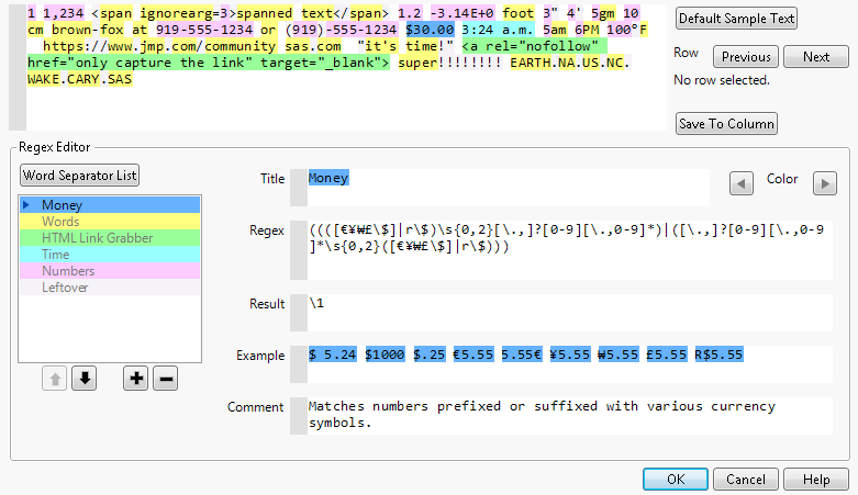 When you select the Customize Regex option, the Text Explorer Regular Expression Editor appears. Use this window to parse text documents using a wide variety of built-in regular expressions, such as phone numbers, times, or monetary values. You can also create your own regular expression definitions.