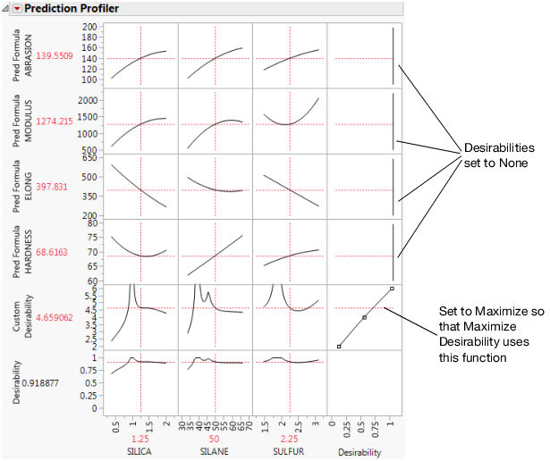 First, create a column called Custom Desirability that contains the above formula. Then, select Graph > Profiler to launch the platform. Select all the Pred Formula columns and the Custom Desirability column and select Y, Prediction Formula. Check the Expand Intermediate Formula option. Turn on the desirability functions by selecting Optimization and Desirability > Desirability Functions from the red triangle menu. All the desirability functions for the individual effects must be turned off. To do this, first double-click in a desirability plot window, and then select None in the window that appears. Set the desirability for Custom Desirability to be maximized.