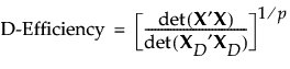 Let X denote the design, or model, matrix for a given assumed model with p parameters. For the definition of the model matrix, see Simulate Responses. Let XD denote the model matrix for a D-optimal design for the assumed model. Then the D-efficiency of the design given by X is as follows: