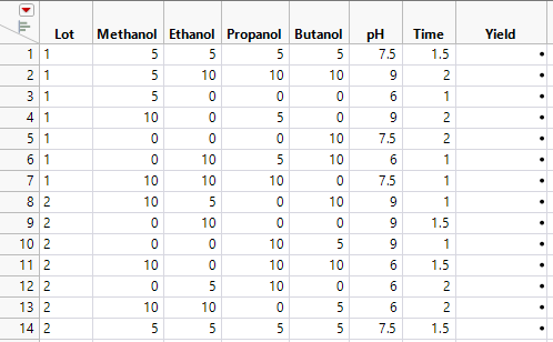 Suppose that, due to raw material constraints, the extraction experiment requires that you run it using material from two separate lots. You can generate a definitive screening design with a blocking variable to account for the potential lot variation.