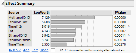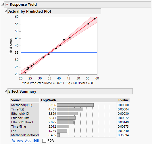 The Actual by Predicted Plot shows no evidence of lack of fit. The Effect Summary report shows that Methanol*Methanol is not significant. You decide to remove this effect from the model.