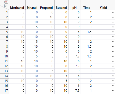The factors and their settings are given in the data table Extraction Factors.jmp. You create a definitive screening design to investigate.