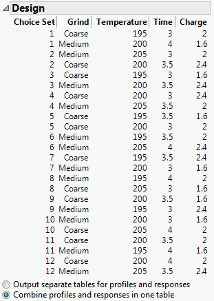 Note: The algorithm for finding an optimal design is based on a random starting design. Because of this, the design you obtain is not unique. The design algorithm will generate different designs when you click the Back and Make Design buttons repeatedly.