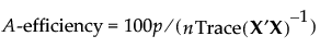 The efficiency of the design to that of an ideal orthogonal design in terms of the A-optimality criterion. A design is A-optimal if it minimizes the sum of the variances of the regression coefficients: