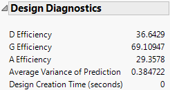 When Evaluate Design is accessed from a DOE platform other than Evaluate Design, the Design Creation Time gives the amount of time required to create the design. When Design Diagnostics is accessed from the Evaluate Design platform, Design Creation Time gives the amount of time required for the Evaluate Design platform to calculate results.