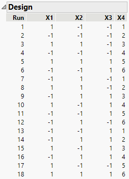 In the design, look at the blocking factor, X4. The six blocks are represented. When you conduct your experiment, each day you will run three trials, where X4 = 1 on the first day, X4 = 2 on the second day, and so on. So you want the design table to randomize the trials within blocks. In the Output Options panel, the Randomize within Blocks option is already selected for Run Order.