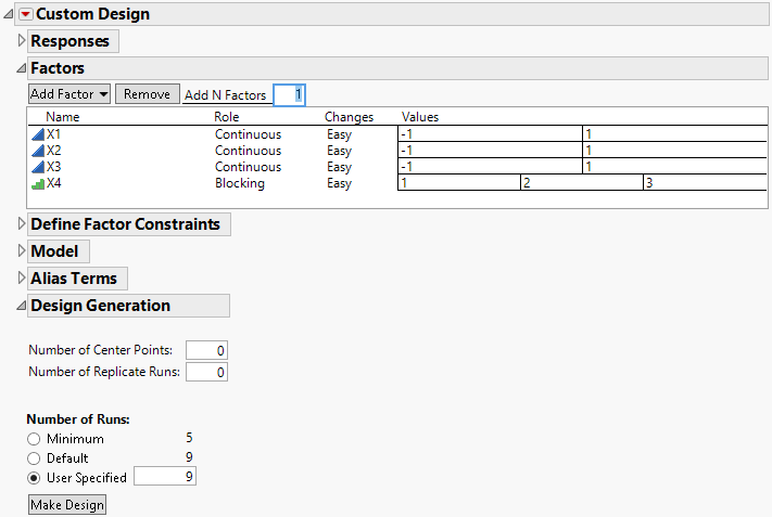 The Factors outline now shows an appropriate number of blocks, calculated as the Default run size divided by the number of runs per block. For this example, the default sample size of 9 requires three blocks. The Factors outline now shows that X4 has three values, indicating the three blocks.