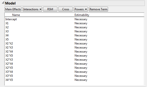 Figure 5.7 shows the runs of the design. All main effects and two-factor interactions are estimable because their Estimability was designated as Necessary (by default) in the Model outline.