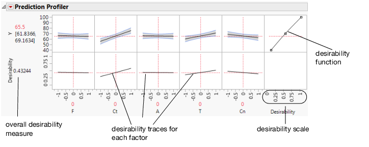 In desirability profiling, you specify a desirability function for each response. The overall desirability for all responses is defined as the geometric mean of the desirability functions for the individual responses. See Derringer and Suich (1980) for information about combining responses.