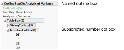 Typically, you want to assign the identified part of the report to a variable so that you can send messages to it easily. For example, to find the Analysis of Variance outline box in the Bivariate report, use this expression: