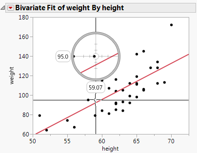 On a fitted line or curve, the crosshairs identify the response value for any predicted value. On a ternary plot, this tool displays triangular crosshair lines.