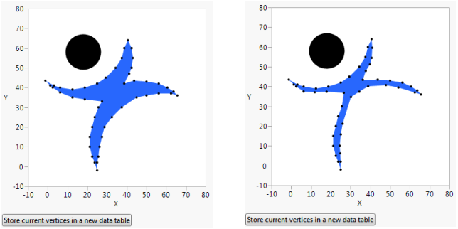 Suppose you want the body of the JMP man to be smaller. Here is how he looks before and after some judicious vertex-dragging. Clicking the button after re-shaping the JMP Man executes the storepoints script to save his new, slender figure in a data table of coordinates.