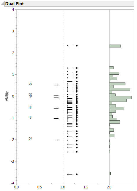 The Dual Plot report contains a plot that shows item difficulty and subject ability in one plot. Difficulty and ability use a common standardized scale shown on the y-axis. The items are plotted by their difficulty on the left side of the plot. The subjects are plotted to the right with data points and a histogram. The dual plot enables you to relate the difficulty of each item to the ability of each respondent.