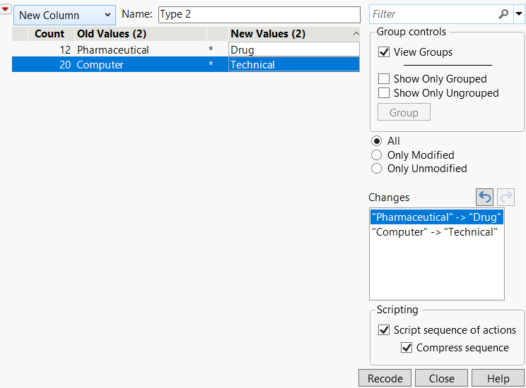 4. In the New Value column of the Recode window, type Technical in the Computer row and Drug in the Pharmaceutical row.