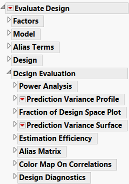 The Factors, Model, Alias Terms, and Design outlines contain information that you enter about the factors, assumed model, potentially aliased effects of interest, and the actual design. JMP populates these outlines using your selections in the launch window and the design table. However, you can modify the effects in the Model and Alias Terms outlines. Once you have made your specifications, the Design Evaluation outlines are updated. You can open these outlines to see reports or control windows that provide information about your design.