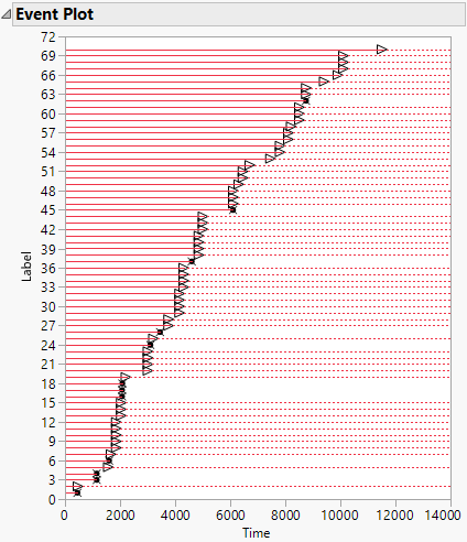 In the Fan.jmp sample data table there is a single Time column indicating failure time. When the failure time is unknown, the value Censored is recorded in the Censor column. All censored units are assumed to be right-censored. Figure 3.7 shows the Event Plot for this data.