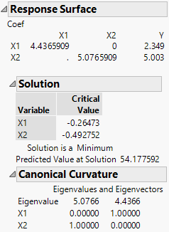 The Solution report shows the critical values. These are the values where a maximum, a minimum, or a saddle point occur. In this example, the Solution report indicates that the response surface achieves a minimum of 54.18 at the critical value, where X1 = -0.265 and X2 = -0.493.