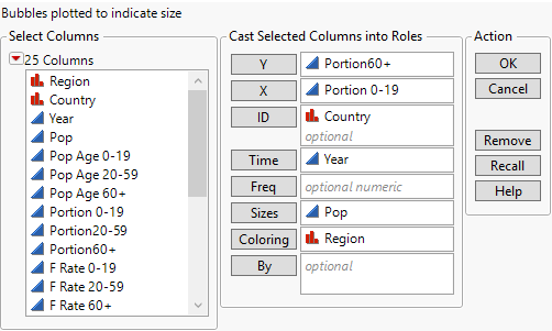 Bubbles for different regions are assigned different colors. See the Region legend in Figure 5.3. The colors shown in the plot are JMP default colors.