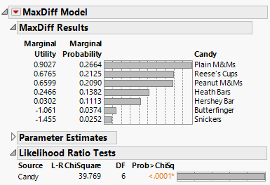 The report indicates that Candy is significant. The three candy types with the highest utilities are Plain M&Ms, Reese’s Cups, and Peanut M&Ms.