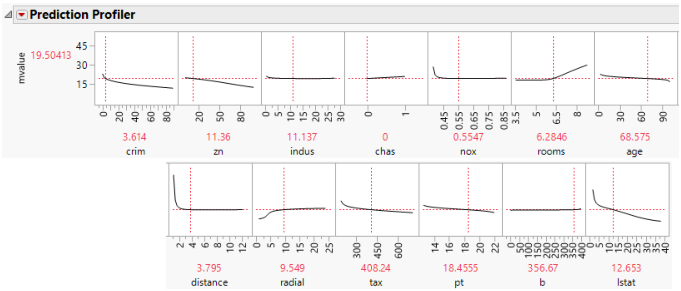 Some of the variables have profiles with positive slopes, and some negative. For example, the variable rooms has a positive slope. This indicates that the more rooms a home has, the higher the predicted median value. The variable pt is the pupil teacher ratio by town. This variable has a negative slope, indicating that the higher the pupil to teacher ratio, the lower the median value.