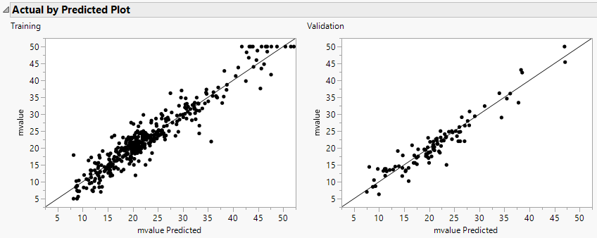 The R-Square statistic for the Validation set is 0.913, signifying that the model is predicting well on data not used to train the model. As an additional assessment of model fit, click the red triangle next to Model NTanH(3) and select Plot Actual by Predicted.