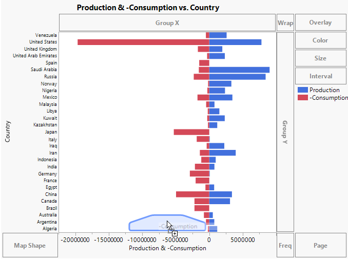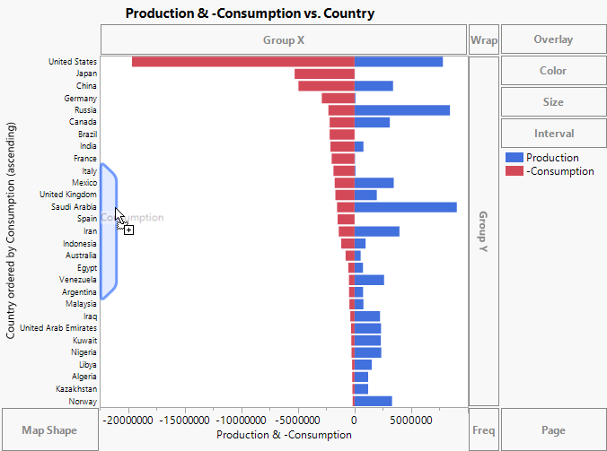 Negative consumption (-Consumption) is plotted on the left in red, and Production is on the right in blue. Next, use the Consumption column as an ordering variable to sort the countries by their oil consumption.