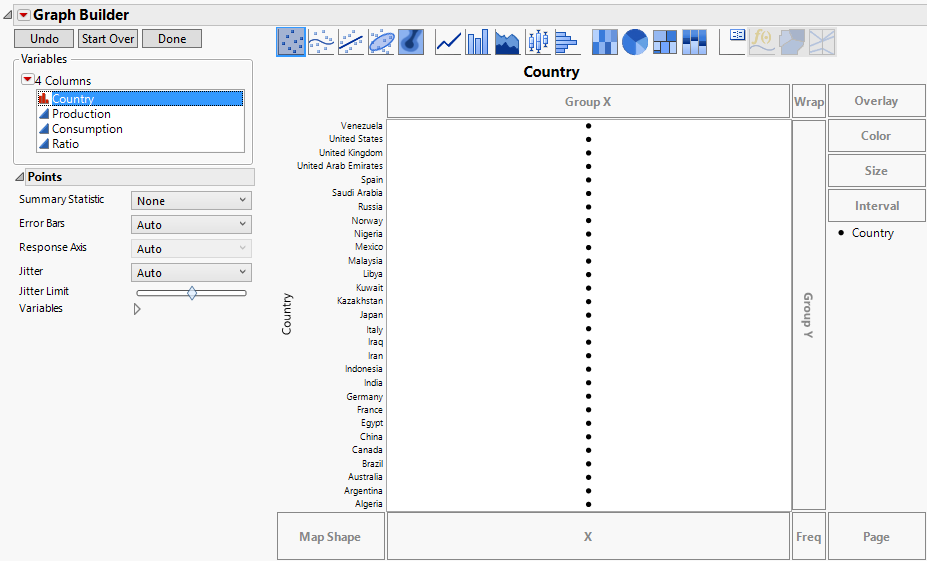 Tip: The countries are ordered in ascending alphabetical (starting point is at the bottom). To change the sorting order, use the Value Order column property or Row Order Levels option. See Value Order or Sorted Order in Using JMP. Alternatively, you can sort using the values of a continuous variable. See Order the Levels of a Categorical Variable in the Graph Builder section.