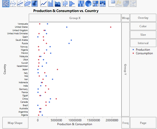 In this example, you have data about oil consumption and production for selected countries. You want to visualize oil consumption and production in a meaningful way.
