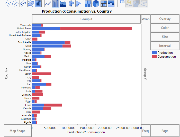 The levels of Country are now ordered by Consumption. The countries that consume the most oil appear at the top of the graph. You can also see each country’s oil production.