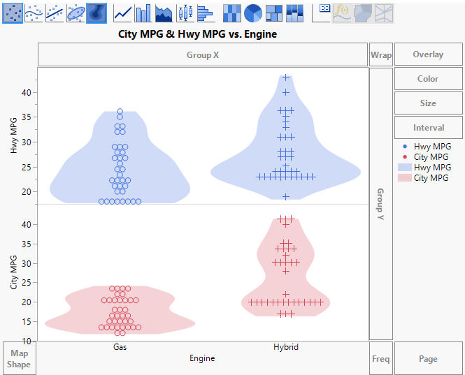 The violin plots are essentially one-dimensional contour plots. They show density outlines of the observations and give information similar to what a histogram or box plot would provide. In this example, the violin plots show you the individual distributions for city and highway MPG for both engine types. You can see that the difference in City MPG for gas and hybrid vehicles is greater than the difference in Hwy MPG.
