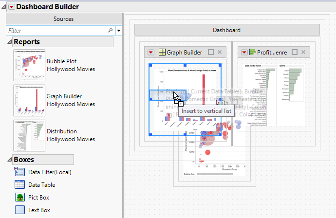 5. In the Reports list, double-click the Graph Builder and Distribution report thumbnails to put them on the dashboard.