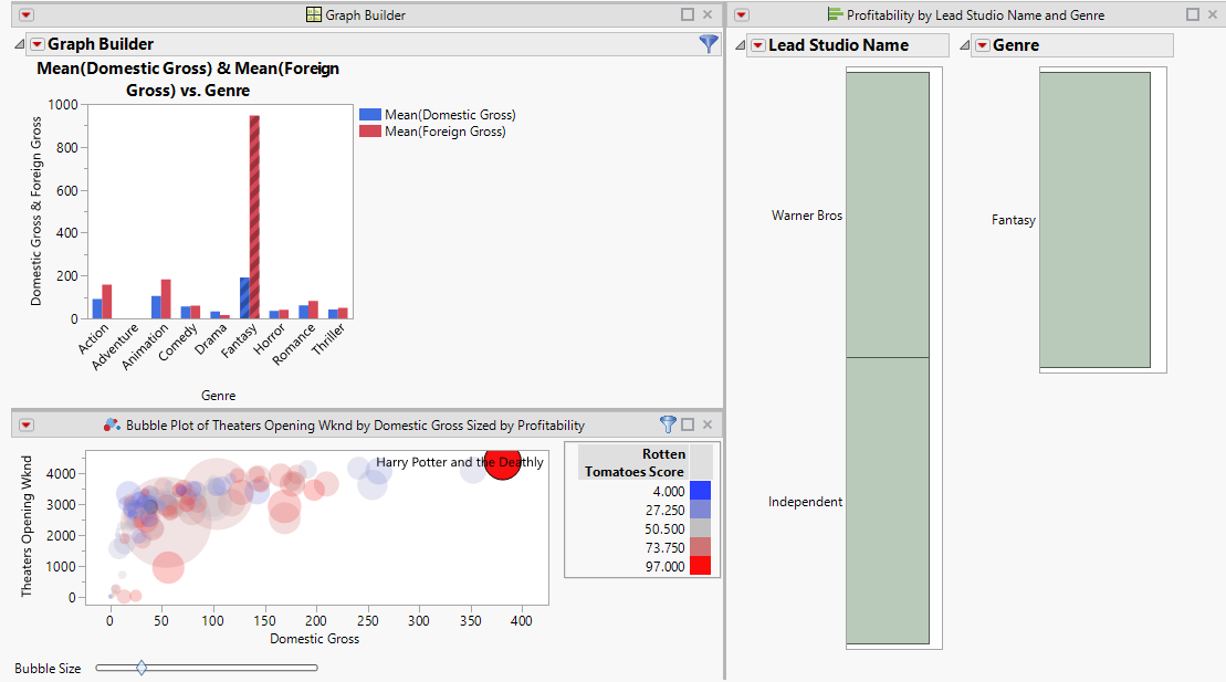 2. To create the reports, run the table scripts named “Distribution: Profitability by Lead Studio and Genre”, “Graph Builder: World and Domestic Gross by Genre”, and “Bubble Plot: Theaters Open Week by Domestic Gross”.