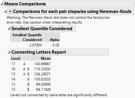 Figure 6.22 Example of Means Comparisons Report for Each Pair Stepwise, Newman-Keuls