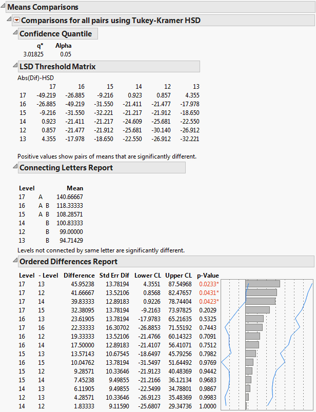 In Figure 6.18, the Tukey-Kramer HSD Threshold matrix shows the actual absolute difference in the means minus the HSD. This value represents the difference that would be significant. Pairs with a positive value are significantly different. The q* (appearing above the HSD Threshold Matrix table) is the quantile that is used to scale the HSDs. It has a computational role comparable to a Student’s t.