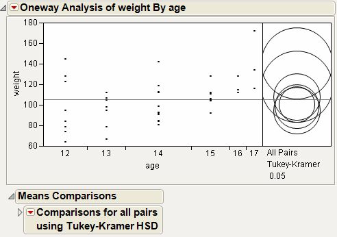 6. Click the red triangle next to Oneway Analysis of weight By age and select Compare Means > All Pairs, Tukey HSD.