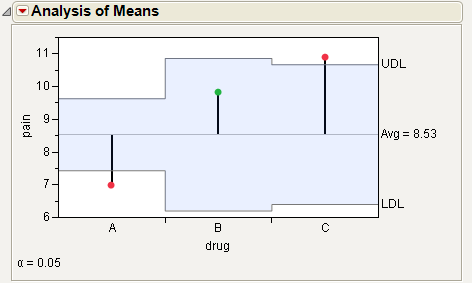 For the example, the means for drug A and C are statistically different from the overall mean. The drug A mean is lower and the drug C mean is higher. Note the decision limits for the drug types are not the same, due to different sample sizes.