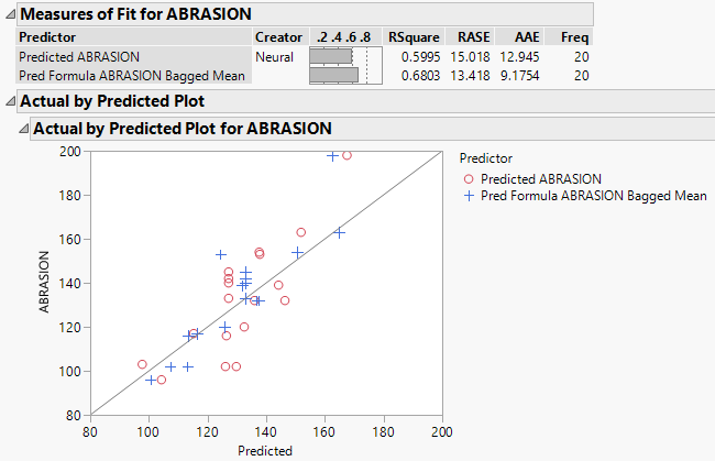 The Measures of Fit report and the Actual by Predicted Plot are shown in Figure 3.32. The predictions that were obtained from bagging are shown in blue. The predictions that were obtained from the original neural network model are shown in red. In general, the bagging predictions are closer to the line than the original model predictions. Because the bagging predictions are closer to the line, the RSquare value of 0.6699 for the bagged predictions is higher than the RSquare value for the original model predictions. You conclude that bagging improves predictions for ABRASION.