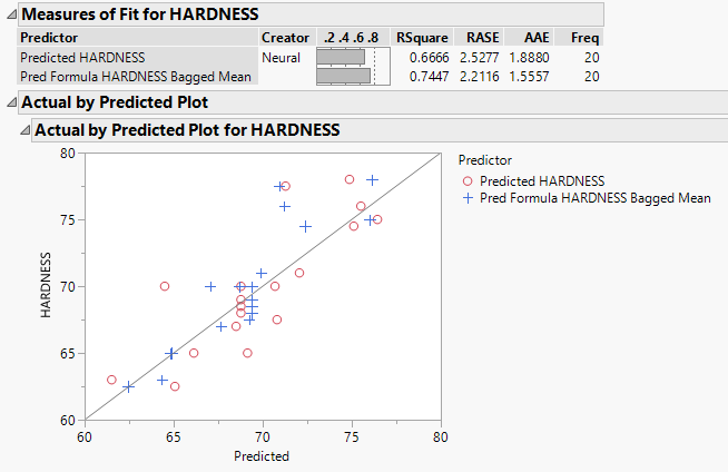 This example compared the predictions for ABRASION. To compare predictions for another response variable, follow step 2 through step 6, replacing ABRASION with the desired response variable. As another example, Figure 3.33 shows the Measures of Fit report for HARDNESS. The report shows similar findings as the Measures of Fit report for ABRASION. The RSquare value for the bagged predictions is slightly higher than the RSquare value for the original model predictions, which indicates a better fit and improved predictions.