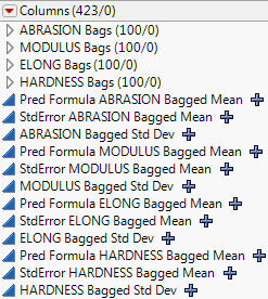 Return to the data table. For each response variable, there are three new columns denoted as Pred Formula <colname> Bagged Mean, StdError <colname> Bagged Mean, <colname> Bagged Std Dev. The Pred Formula <colname> Bagged Mean columns are the final predictions.