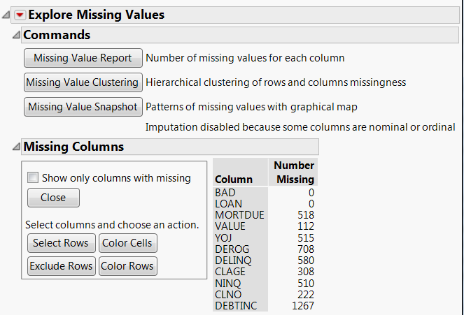 The columns REASON and JOB are not added to the Y, Columns list because they have a Character data type. You can see how many values are missing for these two columns using Distribution (not illustrated in this example).