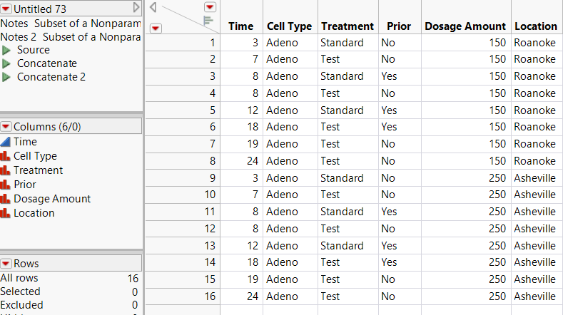 For example, suppose that two cancer trials were conducted at two different hospitals. One of the trials’ data is in the Cancer1.jmp data table, and the other trial’s data is in the Cancer2.jmp data table.