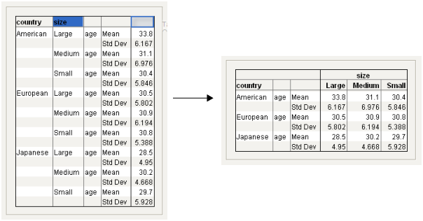 Now your table clearly presents the data. It is easier to see the mean and standard deviation of the car owner age broken down by car size and country.
