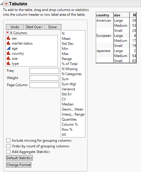 Suppose that you would like to create a table that contains counts for how many people in a survey own Japanese, European, and American cars. You also want the counts broken down by the size of the car.