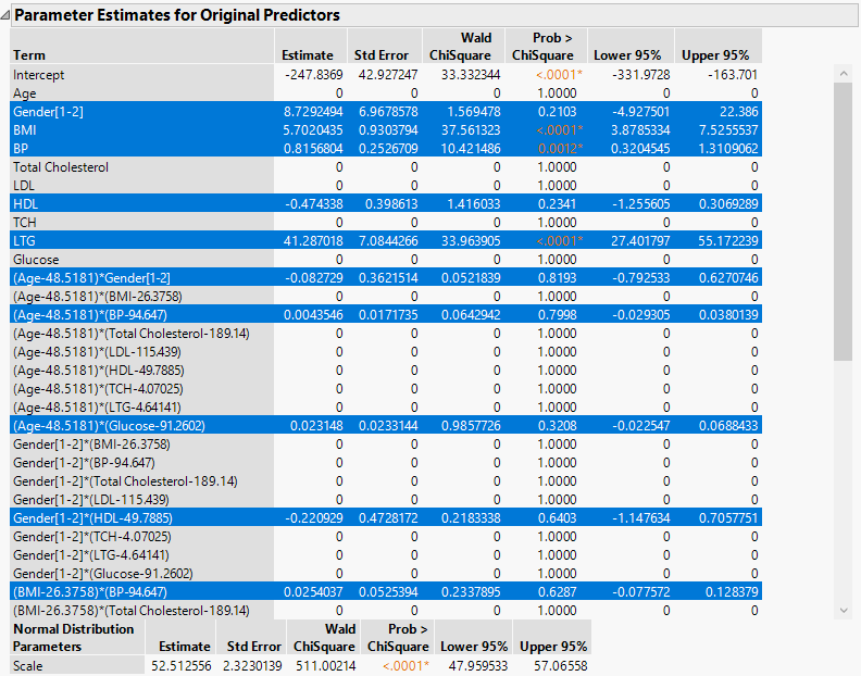 This option highlights the nonzero terms in the Parameter Estimates for Original Predictors report (Figure 6.3) and their paths in the Solution Path Plot. The corresponding columns in the data table are also selected. Note that only 11 of the 55 parameter estimates are nonzero. The scale parameter for the normal distribution (sigma) is also estimated and shown in a separate table at the bottom of the Parameter Estimates for Original Data report. Note that not all of the 55 parameter estimates appear in Figure 6.3.