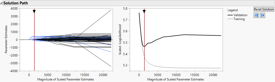 A Normal Lasso with Validation Column report appears. The Solution Path report (Figure 6.2) shows plots of the parameter estimates and scaled negative log-likelihood. The shrinkage increases as the Magnitude of Scaled Parameter Estimates decreases. The estimates at the far right of the plot are the maximum likelihood estimates. A vertical red line indicates those parameter values selected by the validation criterion, in this case, the holdback sample defined by the column Validation.