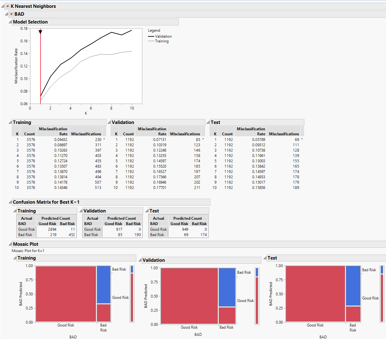 For each value of K, JMP constructs a model using only the training set observations. Each of these models is used to classify the validation set observations. The validation set results are used to select a best model. In this example, the model based on the single nearest neighbor (K = 1) has the smallest misclassification rate. The test set verifies that the single nearest neighbor model is the best performer for independent data.