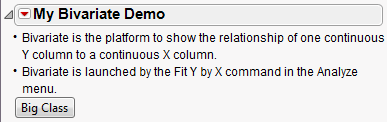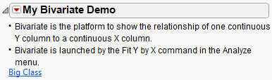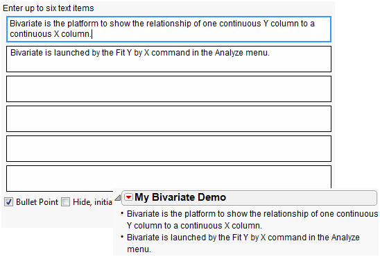 4. To add bullet points into the outline, click the red triangle in the My Bivariate Demo title bar and select Add Text Item.