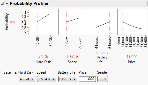 In this example, your company is currently producing laptops with 40 GB hard drives, 1.5 GHz processors, and 6-hour battery life, that cost $1,000. You are looking for a way to make your product more desirable by changing as few factors as possible. You set the current product configuration as the baseline. JMP adjusts the probabilities so that the probability of preference for the baseline configuration is 0.5. Then you compare the probabilities of other configurations to the baseline probability.