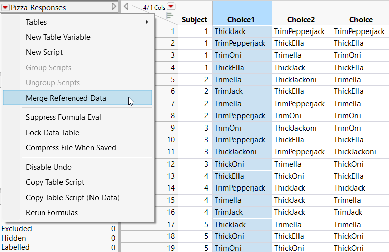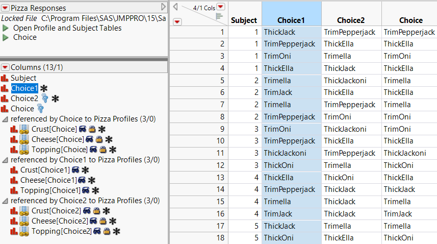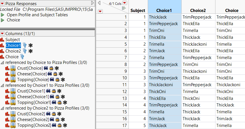 3. Select the Choice1, Choice2, and Choice2 columns in Pizza Responses.jmp and then select Link Reference > Pizza Profiles.jmp.