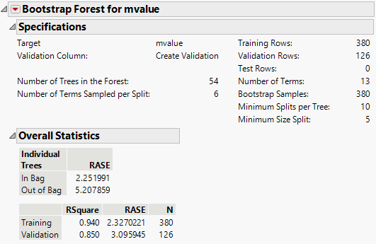 The rows in the training set were used to build the models, so the RSquare statistics for Create Validation = Training might be artificially inflated. In this case, the statistics are not representative of the models’ future predictive ability. This is especially true for the bootstrap forest model.